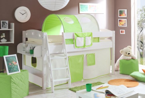 Dieses schöne Hochbett besticht durch einen kinderfreundlichen Aufbau und ansprechendes Design. Die schräge Leiter ermöglicht mit den zusätzlichen Griffmulden einen sicheren und einfachen Aufstieg, auch für die kleinsten!Aufbau: Selbstaufbau, mit ausführlicher MontageanleitungBelastbarkeit (max. kg): min. 75kg (nach DIN741ff.)Besonderheiten: Weiß lackiert (Holzmaserung sichtbar)Bezugsstoff: 100% Baumwolle (Vorhang)Eigenschaften: als normal hohes Einzelbett stellbar, Leiter wahlweise rechts oder links montierbar, mit GriffmuldenFarbe: WeißGewicht: 40kgGruppe: HochbettLieferumfang: Hochbett inkl. Vorhangstoff nach Wahl, Montagematerial und Montageanleitung (ohne Rollrost, Matratze, Betttasche, Tunnel und Dekoration)Liegefläche: 90 x ...